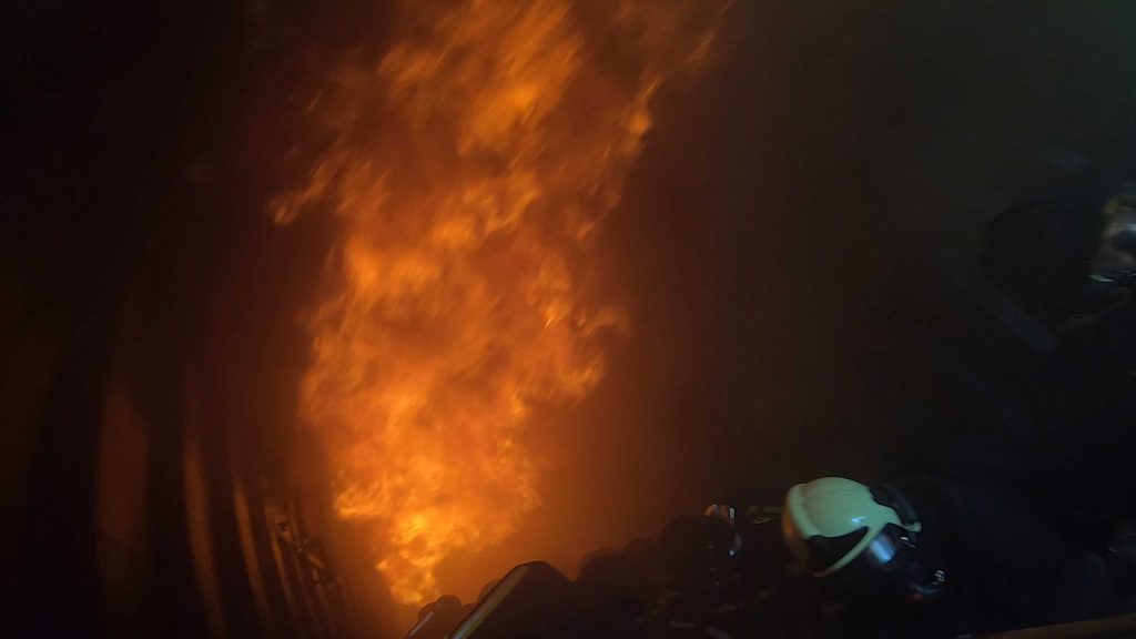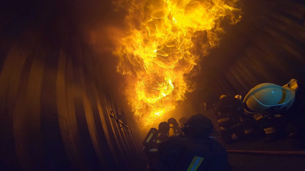 Praktická část se odehrála v Malešicích, kde byl připraven speciální flashover kontejner. Tento tréninkový prostředek umožňuje bezpečně simulovat podmínky skutečného požáru. Hasiči si zde nejprve vyzkoušeli práci s proudnicí, správné dávkování vody a techniku chlazení prostoru. Následně se přesunuli přímo do kontejneru, kde mohli pozorovat chování ohně, vznikající rollovery (převalování plamenné vrstvy pod stropem), a také testovat odolnost svých zásahových obleků v extrémních teplotách.